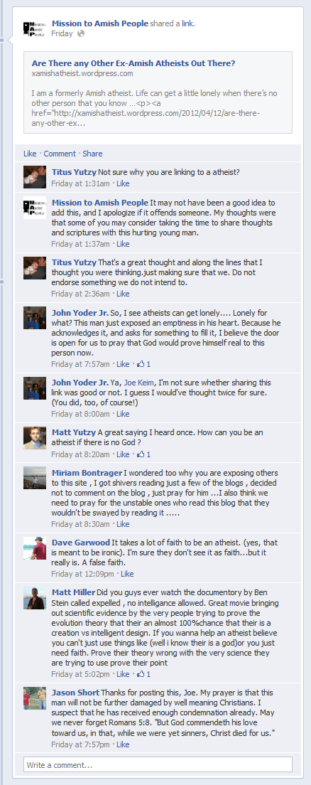 If you’re an ex-Amish atheist or agnostic, please comment on this page so we can get to know each other. I have also started a group on Atheist Nexus for people like us. Please come and join me;